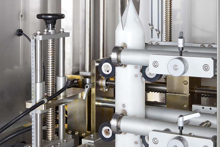 Size changeovers are simple and quick. The cut length can be changed electronically by utilizing the control panels’ touchscreen interface. For different product diameters, a new timing screw and bullet (mandrel) can be installed in minutes, while different product heights are accommodated by raising or lowering the machine with a turn-screw mechanism. The LX-150 comes with our quick change system for switching mandrels with a turn of a knob. Along with the mandrel, the cutter assembly has only two levers to turn, keeping your downtime to a minimum.