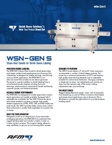 The WSN-GEN S Steam Heat Tunnel for shrink sleeve label and tamper evident band applications from American Film & Machinery is designed for middle, full body, and full body and cap shrink applications. The WSN-GEN S is an all-in-one tunnel that includes its own steam generator. The tunnel is a perfect addition to shrink labeling lines in manufactured goods industries including food and beverage, pharmaceutical, nutraceutical, health and beauty, consumer goods, and chemical products.