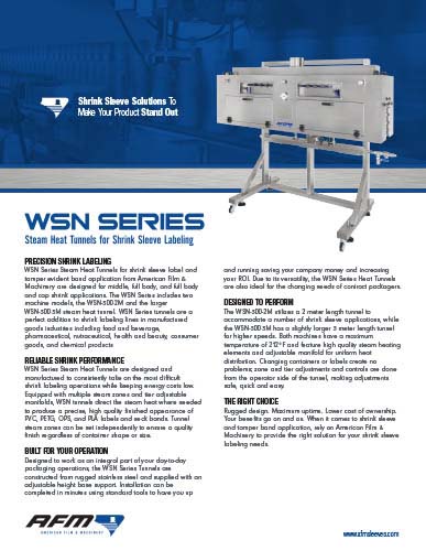 WSN Series Steam Heat Tunnels for shrink sleeve label and tamper evident band application from American Film & Machinery are designed for middle, full body, and full body and cap shrink applications. The WSN Series includes two machine models, the WSN-300-2M and the larger WSN-300-3M steam heat tunnel. WSN Series tunnels are a perfect addition to shrink labeling lines in manufactured goods industries including food and beverage, pharmaceutical, nutraceutical, health and beauty, consumer goods, and chemical products.