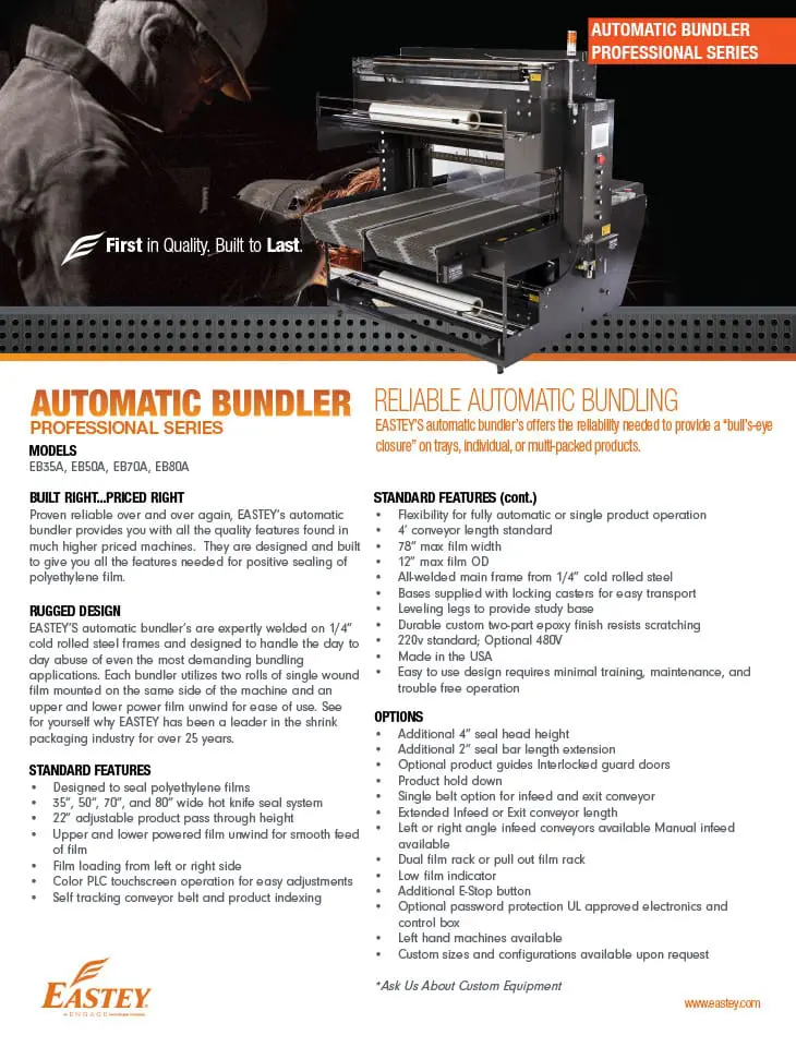 EASTEY’S automatic bundler’s are expertly welded on 1/4” cold rolled steel frames and designed to handle the day to day abuse of even the most demanding bundling applications. Each bundler utilizes two rolls of single wound film mounted on the same side of the machine and an upper and lower power film unwind for ease of use. See for yourself why EASTEY has been a leader in the shrink packaging industry for over 35 years.