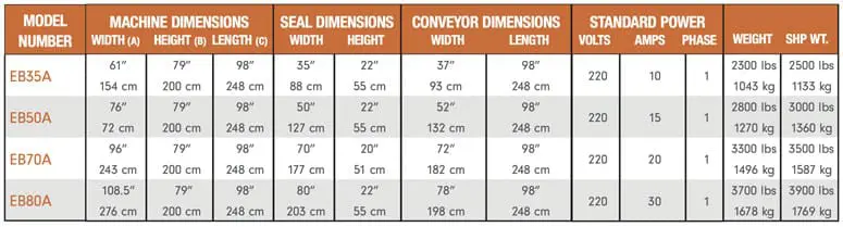 35”, 50”, 70″, & 80”, hot knife seal system ensures a clean, positive, and even seal every time.