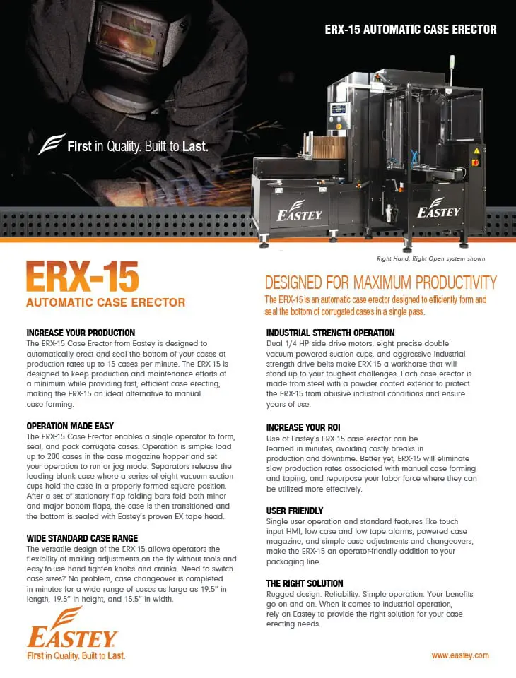 Use of Eastey’s ERX-15 case erector can be learned in minutes, avoiding costly breaks in production and downtime. Better yet, ERX-15 will eliminate slow production rates associated with manual case forming and taping, and repurpose your labor force where they can be utilized more effectively.