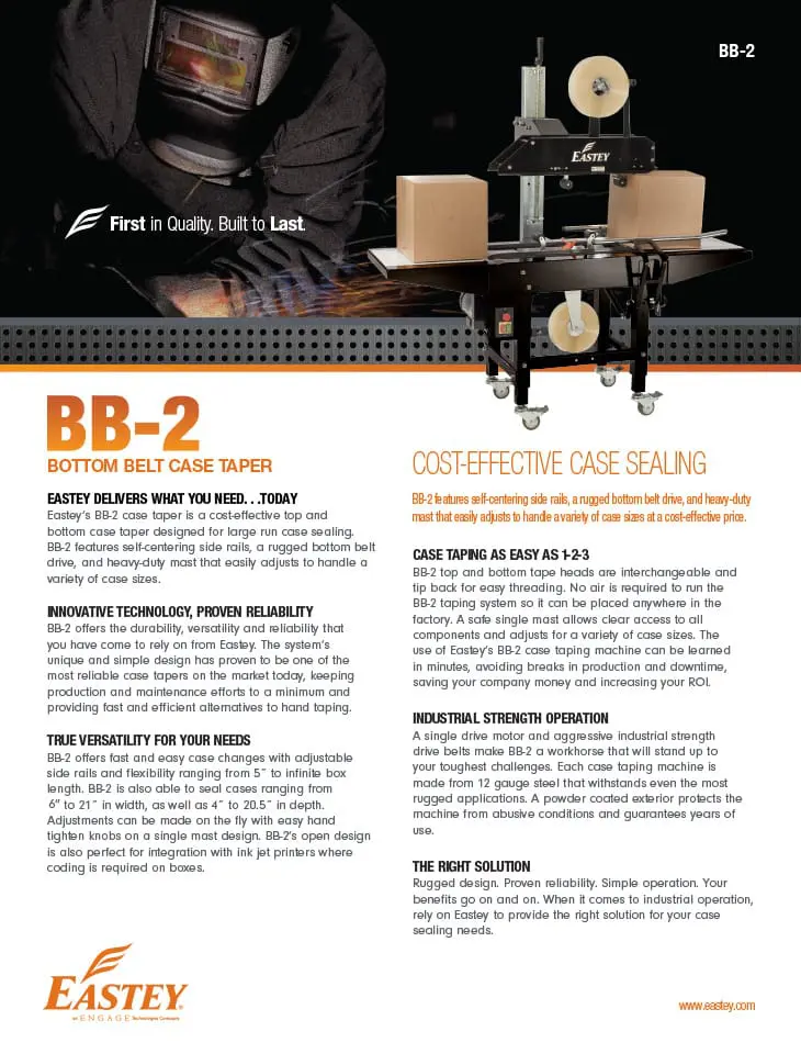 BB-2 offers the durability, versatility and reliability that you have come to rely on from Eastey. The system’s unique and simple design has proven to be one of the most reliable case tapers on the market today, keeping production and maintenance efforts to a minimum and providing fast and efficient alternatives to hand taping.