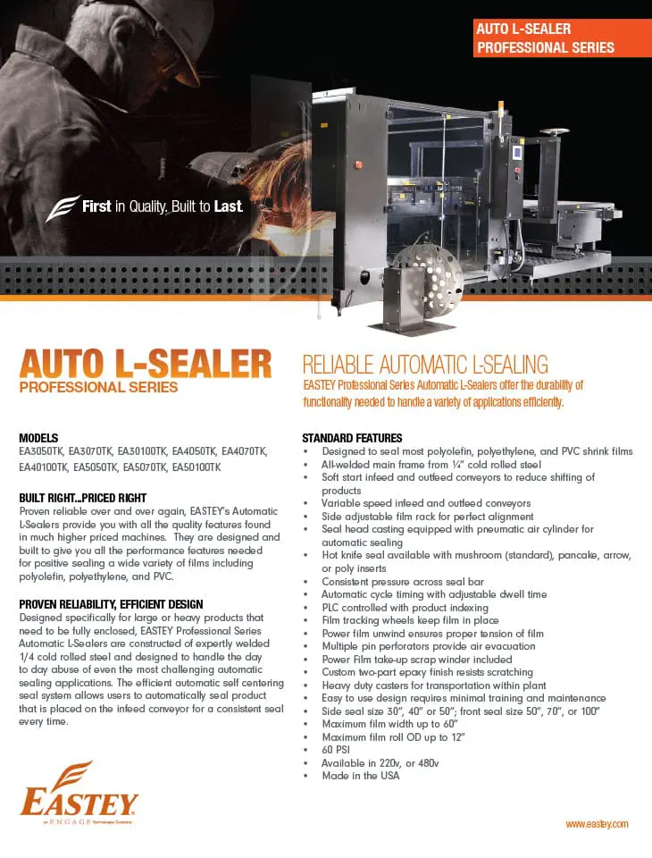 Proven reliable over and over again, Eastey’s Automatic L-Sealers provide you with all the quality features found in much higher priced machines. They are designed and built to give you all the performance features needed for positive sealing a wide variety of films including polyolefin, polyethylene, and PVC.