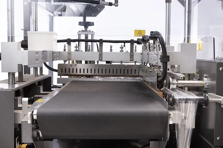 - PTFE hot knife seal bar with vertical cutting motion for consistent and clean seal
