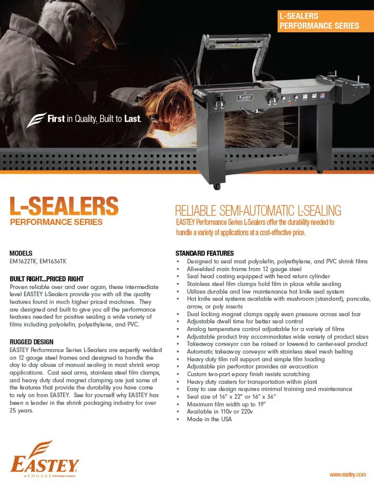 Eastey Performance Series L-Sealers are expertly welded on 12 gauge steel frames and designed to handle the day to day abuse of manual sealing in most shrink wrap applications. Cast seal arms, stainless steel film clamps, and heavy duty dual magnet clamping are just some of the features that provide the durability you have come to rely on from EASTEY. See for yourself why EASTEY has been a leader in the shrink packaging industry for over 25 years.