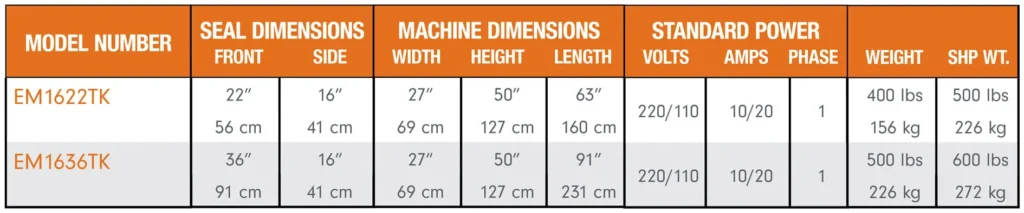 - Seal size of 16” x 22” or 16” x 36”