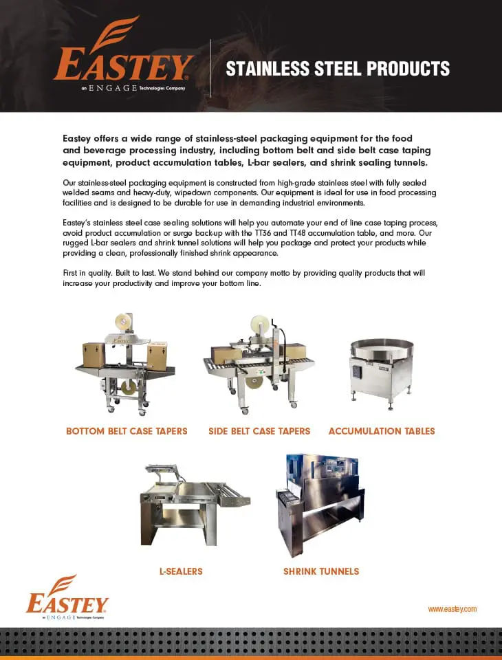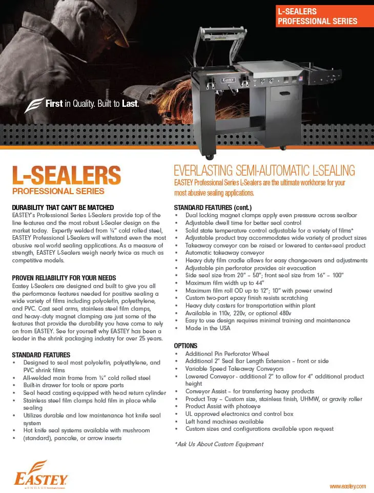 Eastey L-Sealers are designed and built to give you all the performance features needed for positive sealing a wide variety of films including polyolefin, polyethylene, and PVC. Cast seal arms, stainless steel film clamps, and heavy- duty magnet clamping are just some of the features that provide the durability you have come to rely on from EASTEY. See for yourself why EASTEY has been a leader in the shrink packaging industry for over 25 years.