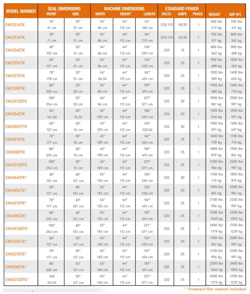 - Side seal size from 20” – 50”; front seal size from 16” – 100”