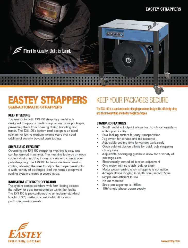The semi-automatic EXS-100 strapping machine is designed to apply a plastic strap around your packages, preventing them from opening during handling and transit. The EXS-100’s bottom seal design is an ideal solution for low to medium volume users that need additional security beyond case taping.