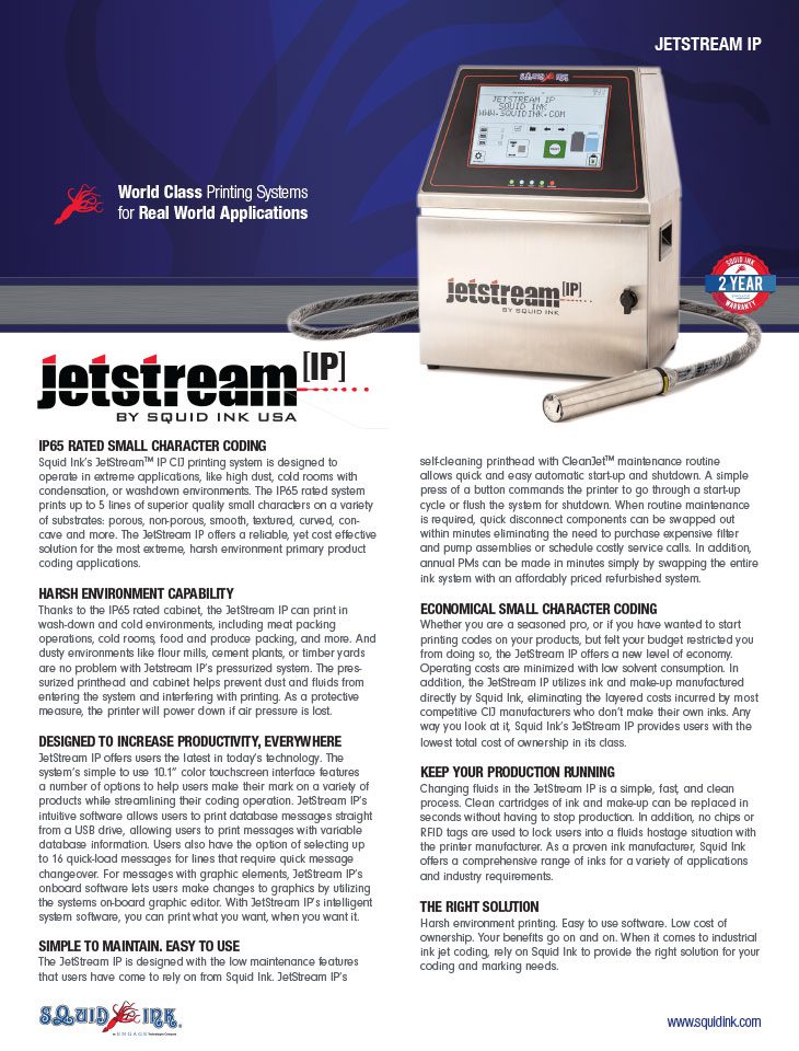 Squid Ink’s JetStreamTM IP CIJ printing system is designed to operate in extreme applications, like high dust, cold rooms with condensation, or washdown environments. The IP65 rated system prints up to 5 lines of superior quality small characters on a variety of substrates: porous, non-porous, smooth, textured, curved, con- cave and more. The JetStream IP offers a reliable, yet cost effective solution for the most extreme, harsh environment primary product coding applications.