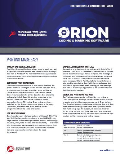 Don’t let your messages be restricted by your software. Orion’s easy-to-use message creation format makes it easier to design and print the messages you want. Orion features True Type font support, multiple user definable time and date code formats including Julian dates and expiration dates, item numbering, logo file support, all standard linear an 2D bar code formats, and more. See today why more and more companies are relying on Squid Ink to provide the right solution for their marking and coding needs.