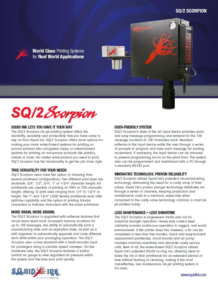 The SQ/2 Scorpion is upgraded with software features that ink jet users need most: increased memory locations for up to 128 messages, the ability to automatically print a manufacturing date and an expiration date, as well as a shift organizer to automatically separate and code different work shifts within your packaging operation. The SQ/2 Scorpion also comes standard with a shaft encoder input for packages using a variable speed conveyor. On the hardware side, the SQ/2 Scorpion features a built-in central air gauge to view regulated air pressure within the system and fine-tune your print quality.