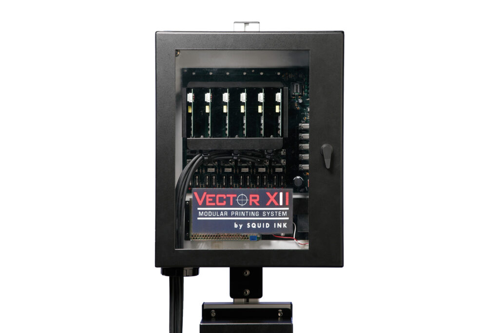 Vector XII ink delivery system allows printing with water-based or solvent-based ink.