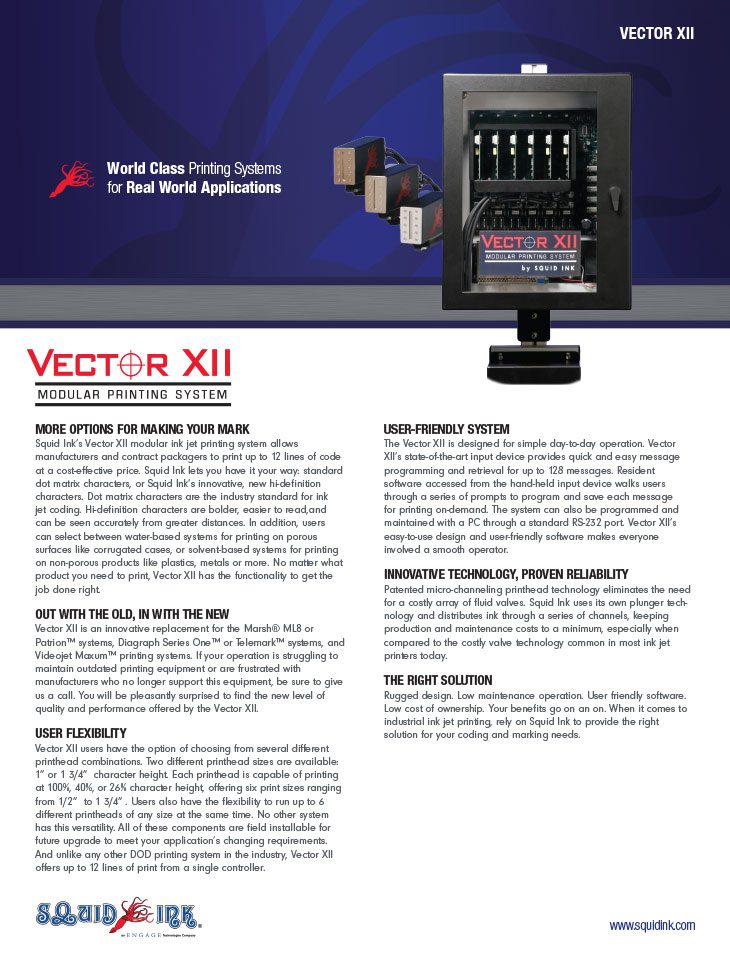 The Vector XII is designed for simple day-to-day operation. Vector XII’s state-of-the-art input device provides quick and easy message programming and retrieval for up to 128 messages. Resident software accessed from the hand-held input device walks users through a series of prompts to program and save each message for printing on-demand. The system can also be programmed and maintained with a PC through a standard RS-232 port. Vector XII’s easy-to-use design and user-friendly software makes everyone involved a smooth operator.
