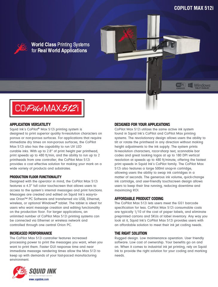 The CoPilot Max 512i lets users meet the GS1 barcode specification for less. CoPilot Max 512i consumable costs are typically 1/10 of the cost of paper labels and eliminate preprinted cartons and SKUs of label inventory. Any way you look at it, Squid Ink’s CoPilot Max 512i provides users with an affordable solution to meet their ink jet coding needs.