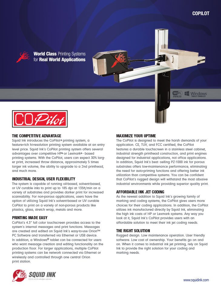 Squid Ink’s CoPilot® printing system is a feature-rich hi-resolution printing system available at an entry level price. The CoPilot printing system offers serveral advantages over competitive TIJ (thermal ink jet) printing systems. With the CoPilot, users can expect 30% larger print, increased throw distance, approximately 5 times larger ink volume, the ability to upgrade to a 2nd printhead and much more.