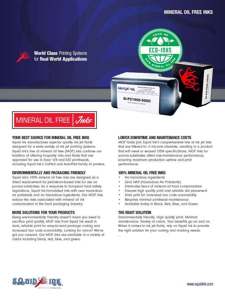 Squid Ink’s 100% mineral oil free inks are designed as a direct replacement for petroleum-based inks for use on porous substrates. As a response to European food safety regulations, Squid Ink formulated inks with zero hazardous air pollutants and no hazardous ingredients. Our MOF inks reduce the risks associated with mineral oil ink contamination in the food packaging industry.