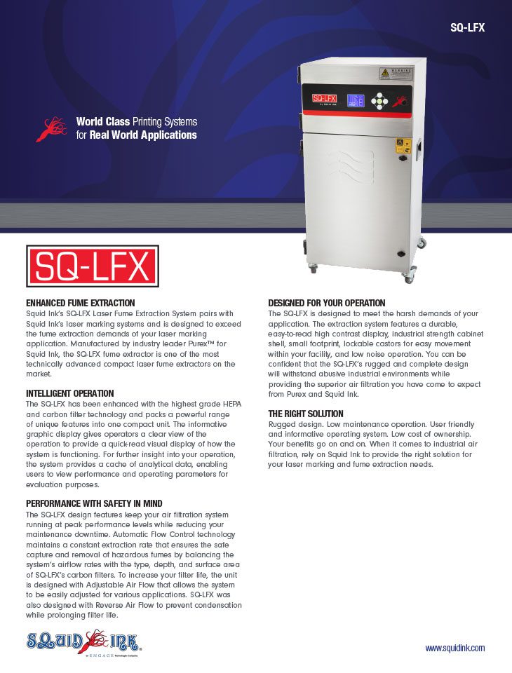 Squid Ink’s SQ-LFX Laser Fume Extraction System pairs with Squid Ink’s laser marking systems and is designed to exceed the fume extraction demands of your laser marking application. Manufactured by industry leader Purex™ for Squid Ink, the SQ-LFX fume extractor is one of the most technically advanced compact laser fume extractors on the market.