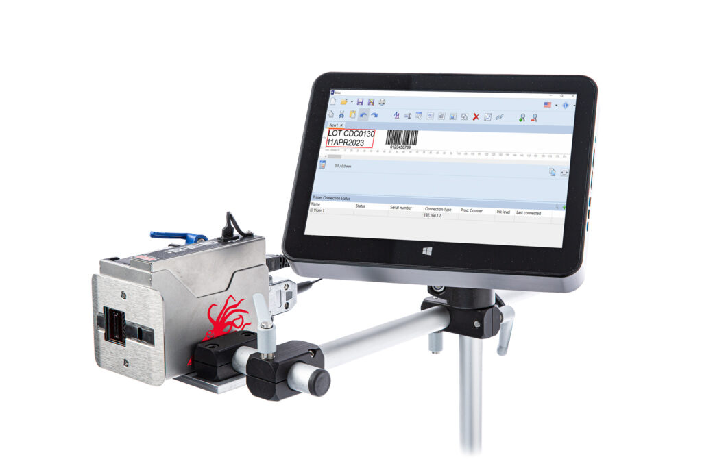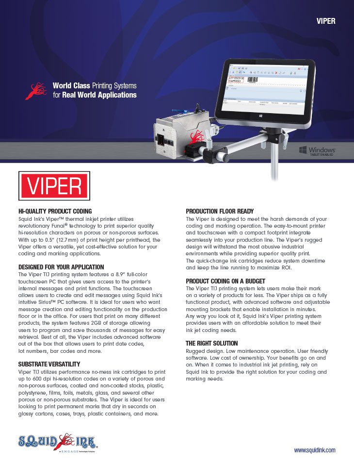 Squid Ink’s Viper™ thermal inkjet printer utilizes revolutionary Funai® technology to print superior quality hi-resolution characters on porous or non-porous surfaces. With up to 0.5” (12.7mm) of print height per printhead, the Viper offers a versatile, yet cost-effective solution for your coding and marking applications.
