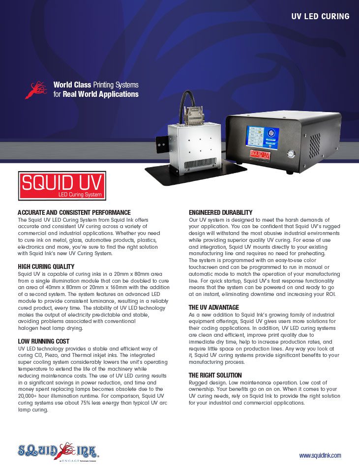 The Squid UV LED Curing System from Squid Ink offers accurate and consistent UV curing across a variety of commercial and industrial applications. Whether you need to cure ink on metal, glass, automotive products, plastics, electronics and more, you’re sure to find the right solution with Squid Ink’s new UV Curing System.