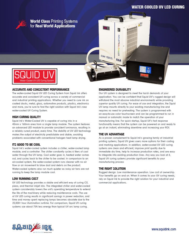 The water-cooled Squid UV LED Curing System from Squid Ink offers accurate and consistent UV curing across a variety of commercial and industrial printing applications. Whether you need to cure ink on coated stocks, metal, glass, automotive products, plastics, electronics and more, you’re sure to find the right solution with Squid Ink’s new water-cooled UV Curing System.